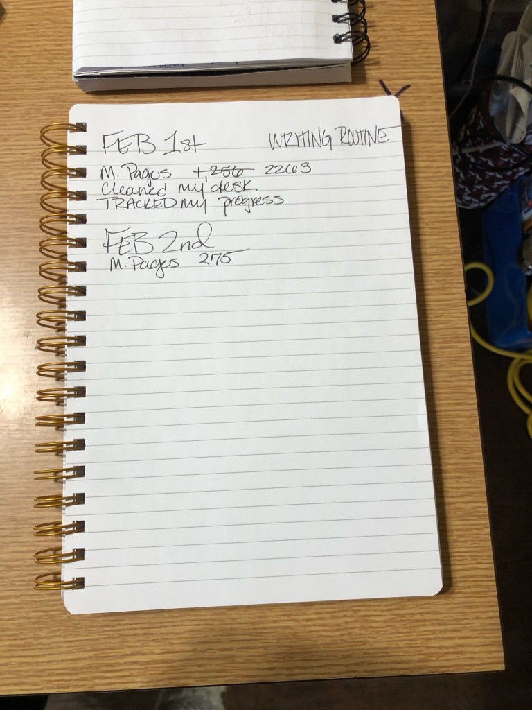 It’s not horrible, but it’s also not conducive to focused writing. I needed to remove all the unnecessary and nonessential items and get myself organized. Now I have everything within reach and I have my writing routine calendar right in front of me