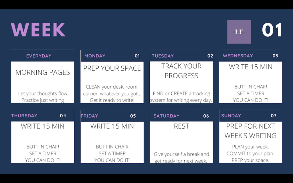 PREP FOR NEXT WEEK. If you’ve already been to linseyewing.com and gotten your free resources, you should have a guide for next week already, but you can always schedule on different days. The point is to get a routine. Make time to do 4 writing sessions instead of 3. Plan for 2 of those to be 20 minutes instead of 15.